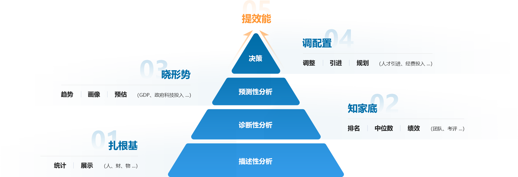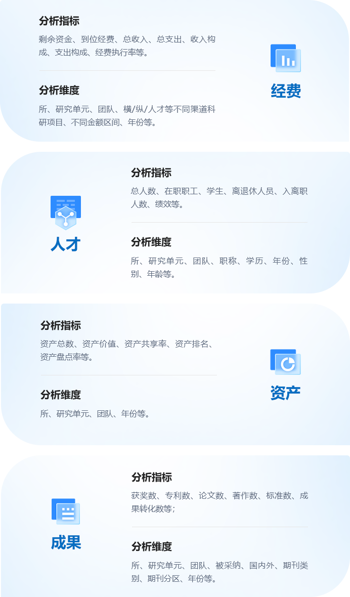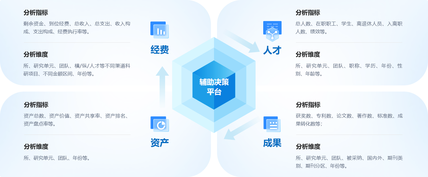 輔助決策平臺(tái)是基于科研數(shù)據(jù)和科研指標(biāo),利用先進(jìn)算法、可視化、大模型等技術(shù),為科研決策者提供數(shù)據(jù)支持和建議的信息化系統(tǒng)。平臺(tái)為科研單位建立數(shù)據(jù)標(biāo)準(zhǔn),搭建數(shù)據(jù)中臺(tái),將內(nèi)外部科研數(shù)據(jù)進(jìn)行有機(jī)融合,讓科研決策者一手掌握本單位科研項(xiàng)目、經(jīng)費(fèi)、資產(chǎn)、科研成果、人才隊(duì)伍建設(shè)情況,了解國(guó)家/同行業(yè)單位發(fā)展趨勢(shì),找準(zhǔn)本單位科研水平所處位置,制定人才引進(jìn)、經(jīng)費(fèi)申請(qǐng)、資源配置相關(guān)制度和戰(zhàn)略規(guī)劃,從而提升本單位整體科研能力。